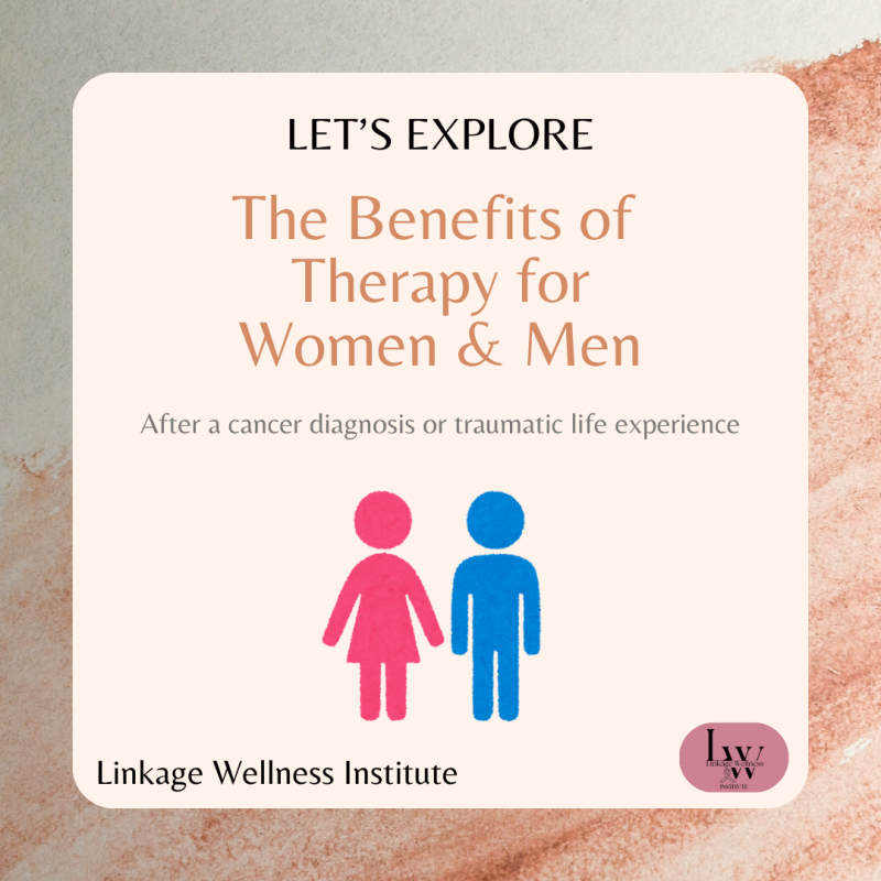 At Linkage Wellness Institute, we feel that a cancer diagnosis or a traumatic experience can shake the foundation of a person’s life. All forms of Therapy offer a stabilizing force for both women and men as they navigate the emotional, physical, and relational impact of what they’ve been through. We strongly believe in therapy as a form of intense self-care.