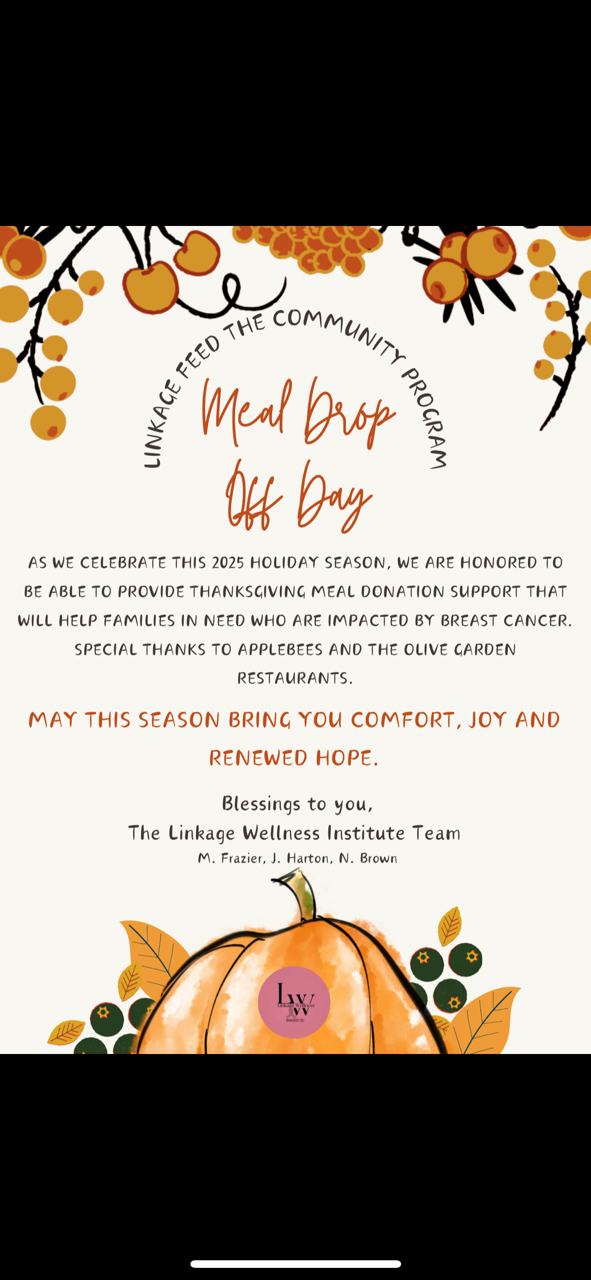 In 2024 for Thanksgiving we launched our Linkage "Feed the Community" Program. Linkage Wellness Institute partnered with 3 local restaurants to successfully Fed 6 families within the DMV area.